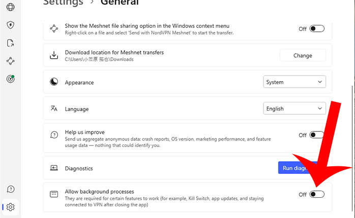Enabling “Allow Background Processes” allows you to use certain features even when the NordVPN app is closed and not visible on the screen or taskbar.