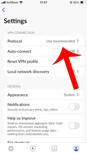 Open the NordVPN app on your iPhone, then tap the “Profile Icon” in the bottom menu, followed by the “Gear Icon” to access the settings.