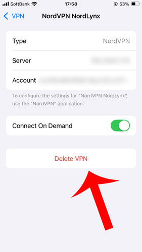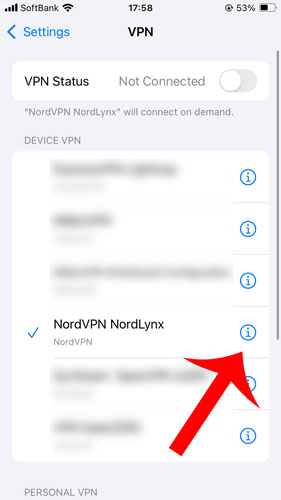 In the Device VPN section, find “NordVPN” and tap the “Info icon.”