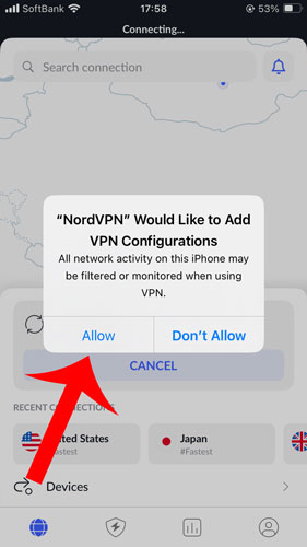 When the message “NordVPN wants to add VPN configurations” appears, tap “Allow.”